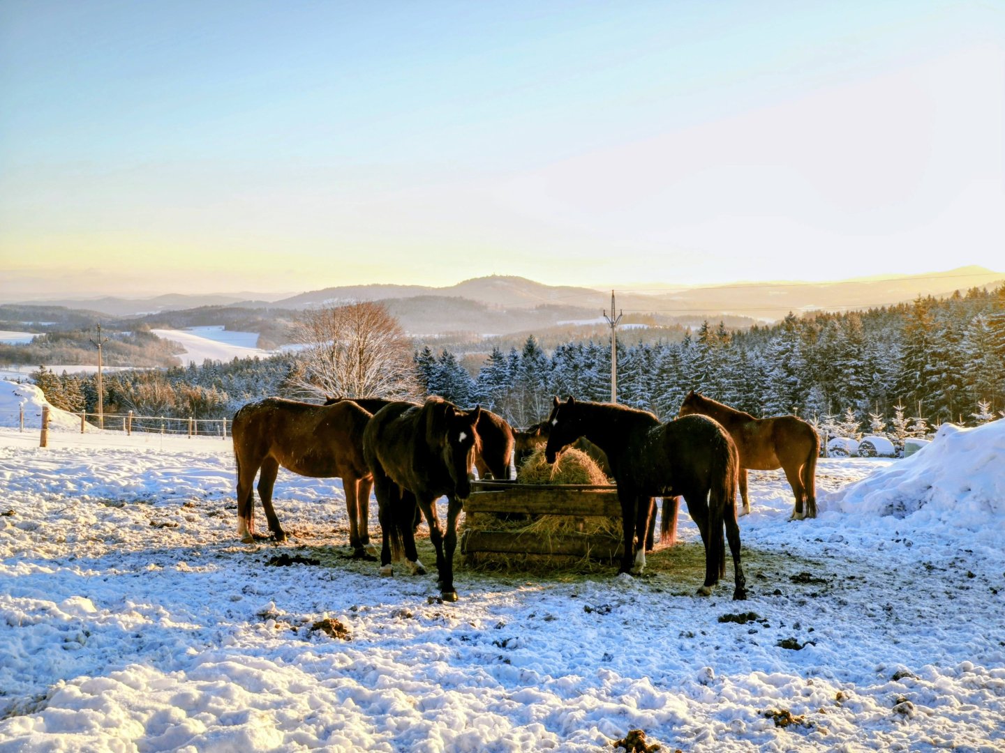 Im Winter stehen den Pferden geräumige Unterstände und unbegrenzte Mengen an hochwertigem Heu an den Futterraufen zur Verfügung, sodass alle Tiere nach Bedarf Zugang zum Futter haben. Die Herden sind größer (30 – 40 Pferde) und altersgemischt, sodass Absetzer, Jungpferde, Pferde im Training sowie Senioren im Ruhestand zusammenleben. Diese Art der Aufzucht wirkt sich sowohl auf die Psyche als auch auf die Physis positiv aus.
