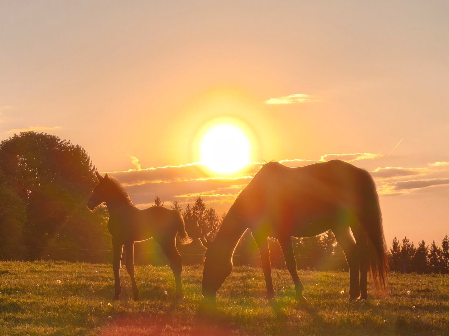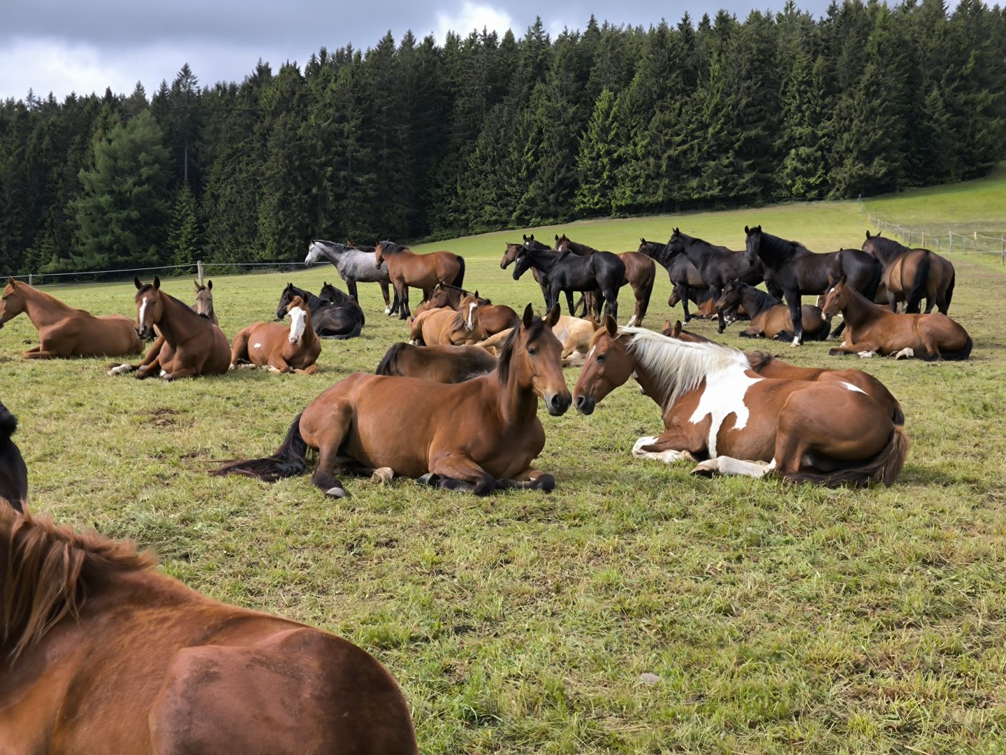 Fohlen wachsen bei uns in einer gemischten Herde auf, in der sie auf natürliche Weise soziale Kompetenz und Respekt lernen. Der Aufenthalt im Freien bei jedem Wetter und der ständige Kontakt mit anderen Pferden stärken ihre psychische Widerstandsfähigkeit und körperliche Kraft. Wir betreuen jedes Fohlen individuell und gewöhnen es an den Kontakt zum Menschen sowie an den grundlegenden Umgang, um den Übergang zum späteren Training so einfach wie möglich zu gestalten. Bevor sie mit dem eigentlichen Training beginnen, erlangen sie bei uns die wichtigsten Grundlagen: Respekt vor der Herdenhierarchie und Vertrauen zum Menschen. Nach unserer Erfahrung ist ein Pferd, das in einer Herde mit Gleichaltrigen aufgewachsen ist, viel berechenbarer und besser auf die künftige Arbeit vorbereitet. Jungpferde haben bei uns den Raum, in Ruhe erwachsen zu werden.