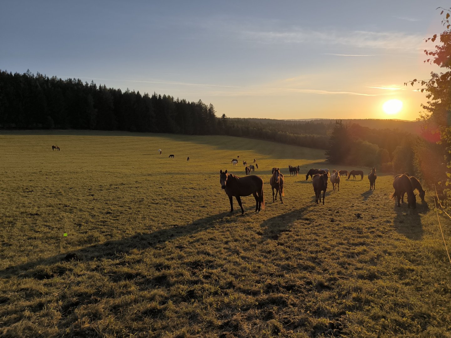 Das Bergklima des Böhmerwalds (Šumava) ist ideal für Pferde mit Atemwegsproblemen. Aufgrund unserer Lage und Herangehensweise sind wir ein gefragter Ort für Pferde im Ruhestand. Die 24/7-Haltung an der frischen Luft in Kombination mit hochwertigem Heu bewirkt Wunder für ihren Gesundheitszustand.