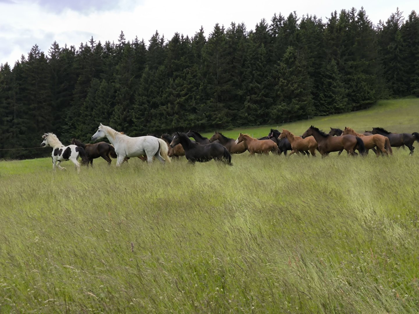 Die Grundlage unserer Haltung ist ausreichend Platz. Unsere 40 ha großen Weiden liegen in einer hügeligen Landschaft, fernab von Pestiziden und Spritzmitteln. Gerade diese natürliche Bewegung in den Hügeln hilft den Pferden, eine gute Kondition, Koordination und robuste Gesundheit zu bewahren.